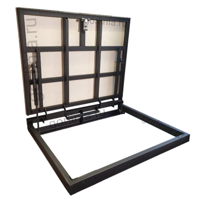 Дверка лежит на опорных поверхностях, которые одновременно являются периметром. Мы подходим рамой вплотную к прилегающему полу, поэтому плитка клеится на дверцу с минимальным вылетом.