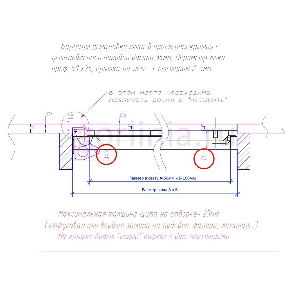 Со стороны петли на паразитку приходит деревянный пол толщиной до 35 мм с четвертью 15 мм. Дверь обшивается наборной доской или щитом толщиной 25 мм через специальные полосы вдоль или поперек с запилом торца на угол, как на схеме, чтобы отворило открывалось при дверном зазоре 2-4 мм.
