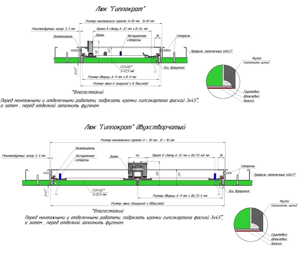Конструкция крепится в каркас перегородки или фальшпотолка (см. монтажную схему), выставляется в уровень финишного слоя, далее декорируется материалом общей отделки поверхности. Маяками служит профиль полотна, заполненного гипсоволокном.