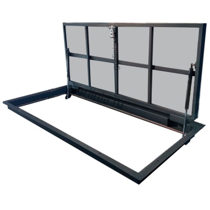 Каркас полотна сварен из трубы 30х20 в комбинированных положениях с заполнением ГВЛ в уровень наличника коробки под отделку плиткой с эффектом невидимки, сохранением рисунка и швов раскладки керамогранита в помещении. Для открывания лаза в подвал 1150х500 используется съемная ручка.