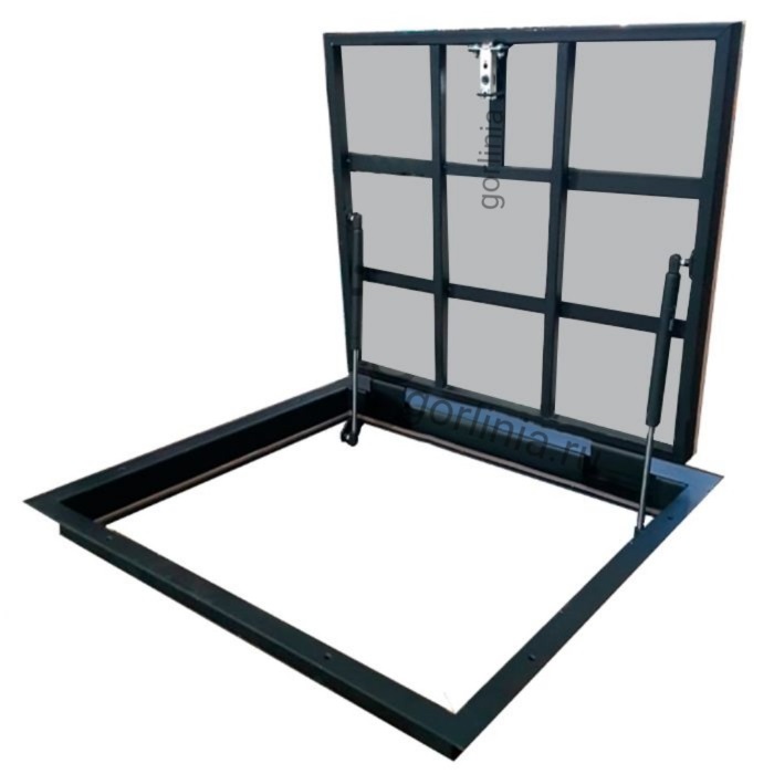 Детали каркаса выполнены из стального проката 3 мм. Крышка обвязана трубой 30х20 в комбинированном положении. Заполнение дверцы - ГВЛ под скрытую облицовку керамической плиткой по принципу невидимки.