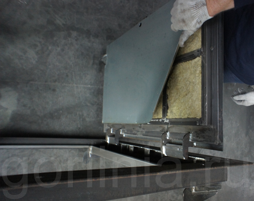 Люк сварен в раме из равнополочного уголка горячего проката. Внешние размеры конструкции составляют 715х1115 мм. Установка производится методом погружения в напольный проем 600*1000 мм. Петли расположены по стороне 1000 мм.